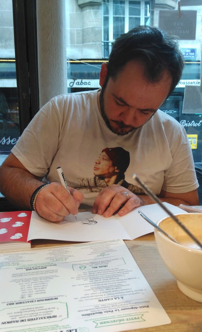 Le dessin fait partie intégrante de son quotidien et, même dans une rame de métro, lui permet d’être seul avec ses idées. Dans ses affaires, plus de 400 croquis, ou crobards, ces esquisses faites d’un seul et unique jet. C’est au début une page Facebook qui est née, avec des représentations de ses amis, de sa femme et de son fils, Gabin. Des dessins tous réunis par le même thème, l’amour. Thème universel, ponctué de nostalgie, mais surtout qui contraste avec la noirceur et la violence du graffiti actuel. Après les attentats contre Charlie Hebdo, il y avait publié un dessin de Cabus sur un nuage… Poussé par les internautes, l’idée est venue d’un faire un livre. C’en est devenu un superbe album et objet, après 4 longs mois de travail. Damien Jouillerot a d’ailleurs participé avec Stéphanie des éditions Akinomé à la création du livre, de la sélection des 120 croquis, au maquettage, en passant par la photogravure et le choix des citations allant accompagner chaque page.